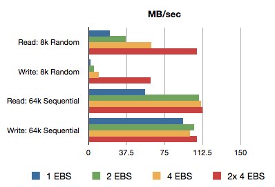 PIOPS work when you want raw IOPS, but you have to make sure you’re using the EBS optimized instances. PIOPS also don’t make sense on smaller instances (like the m1.large) – throughput is limited by the smaller instance size. I got the best results with CC2 instances, but the m2.4xlarge does well enough for the 1Gbps instance types.