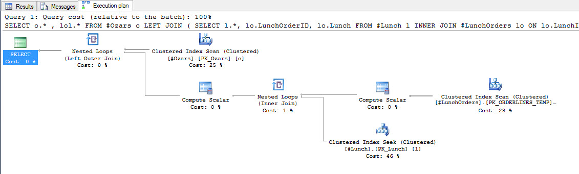 SELECT o.* , lol.* FROM #Ozars o LEFT JOIN ( SELECT l.*, lo.LunchOrderID, lo.Lunch FROM #Lunch l INNER JOIN #LunchOrders lo ON lo.LunchID = l.LunchID ) lol ON o.OzarID = lol.OzarID |