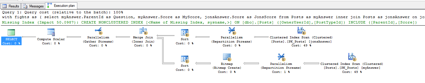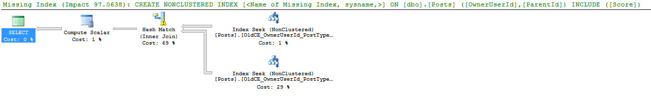 I’m using the public Stack Overflow database export, and I’m running this Jon Skeet comparison query from Data.StackExchange.com. (Note that it has something a little tricky at the top – it’s using a local variable for the @UserId, which itself makes for a different execution plan. When literals are used in the query, the behavior is different, but that’s another story for another blog post.)