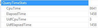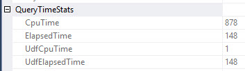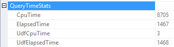 If a query uses one or more user-defined scalar functions (such as T-SQL functions or CLR functions), a significant portion of query execution time may be spent inside those functions, depending on the function definition. This may be not immediately obvious by looking at the query execution plan. This update adds two new attributes to QueryTimeStats: UdfCpuTime and UdfElapsedTime. These provide the total CPU and elapsed time that is spent inside all scalar user-defined functions (in milliseconds) during the execution of a query.
