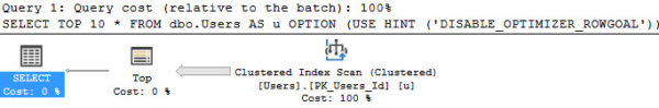 SELECT TOP 10 * FROM dbo.Users AS u OPTION (USE HINT ('DISABLE_OPTIMIZER_ROWGOAL')) GO |