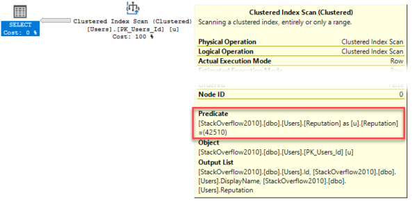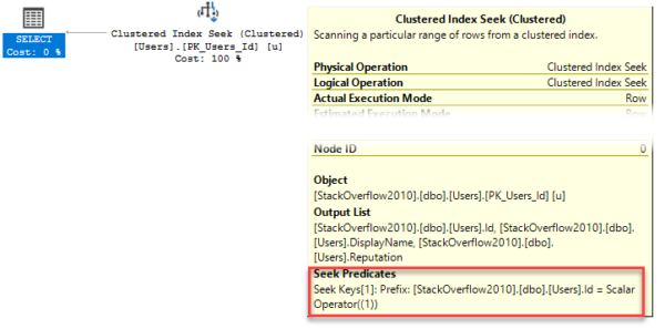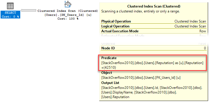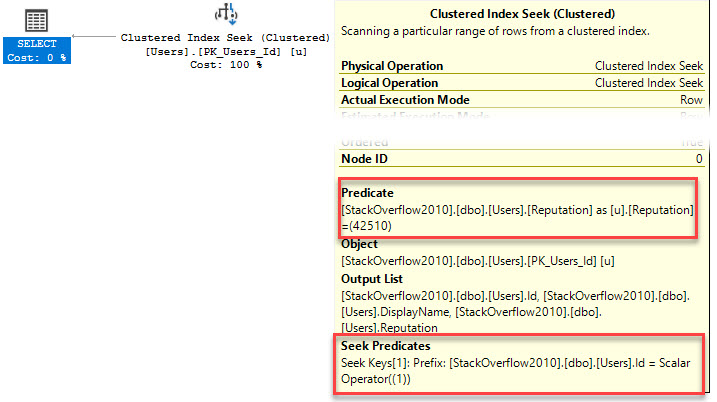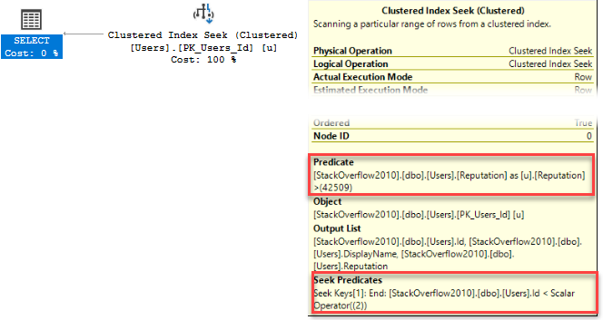 The first query plan looks like this, seeking to the right key, and then evaluating the predicate on Reputation. This one is using the clustered index.