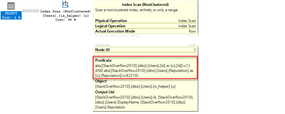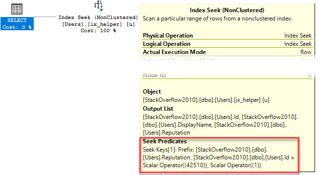 CREATE INDEX ix_helper ON dbo.Users(Reputation, Id) INCLUDE (DisplayName); SELECT Id, u.DisplayName, u.Reputation FROM dbo.Users AS u WITH (INDEX = PK_Users_Id) WHERE u.Id = 1 AND u.Reputation = 42510 SELECT Id, u.DisplayName, u.Reputation FROM dbo.Users AS u WITH (INDEX = ix_helper) WHERE u.Id = 1 AND u.Reputation = 42510 |
