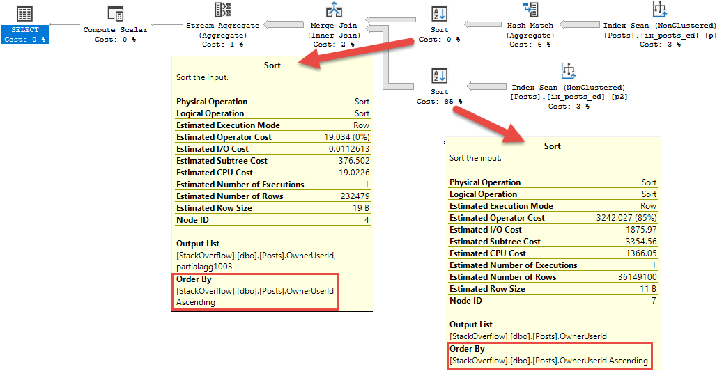 Just like a Stream Aggregate, Merge Joins need sorted input. There’s some sense to this plan, in that with two Sorts, you can deduplicate some amount of data prior to sorting. There’s also that Stream Aggregate after the Merge Join, which needs sorted input. If the Sort were after the Merge Join (for some strange reason), there could be a whole lot more data to sort.