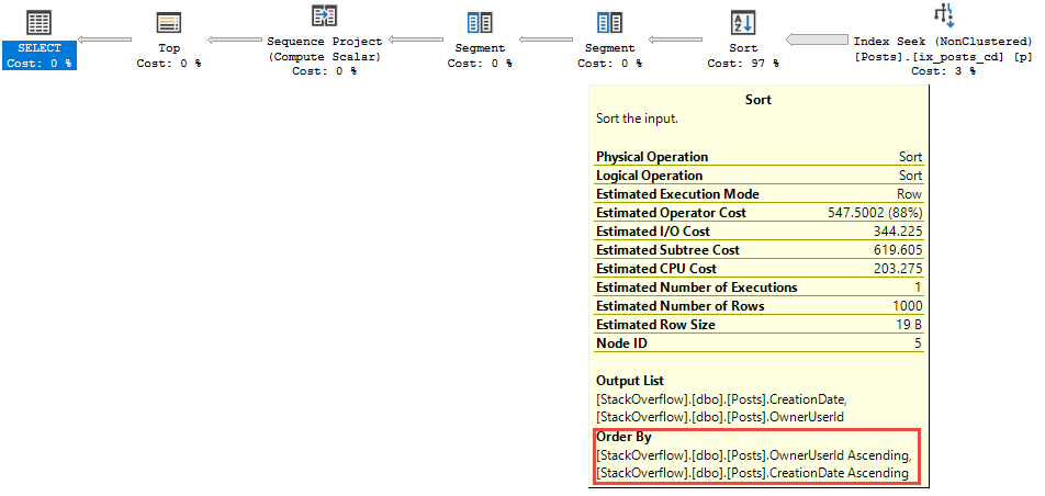 There’s an order by here, but the Sort has almost nothing to do with it. All of these queries use the same index as before. The order by for CreationDate is fully supported.
