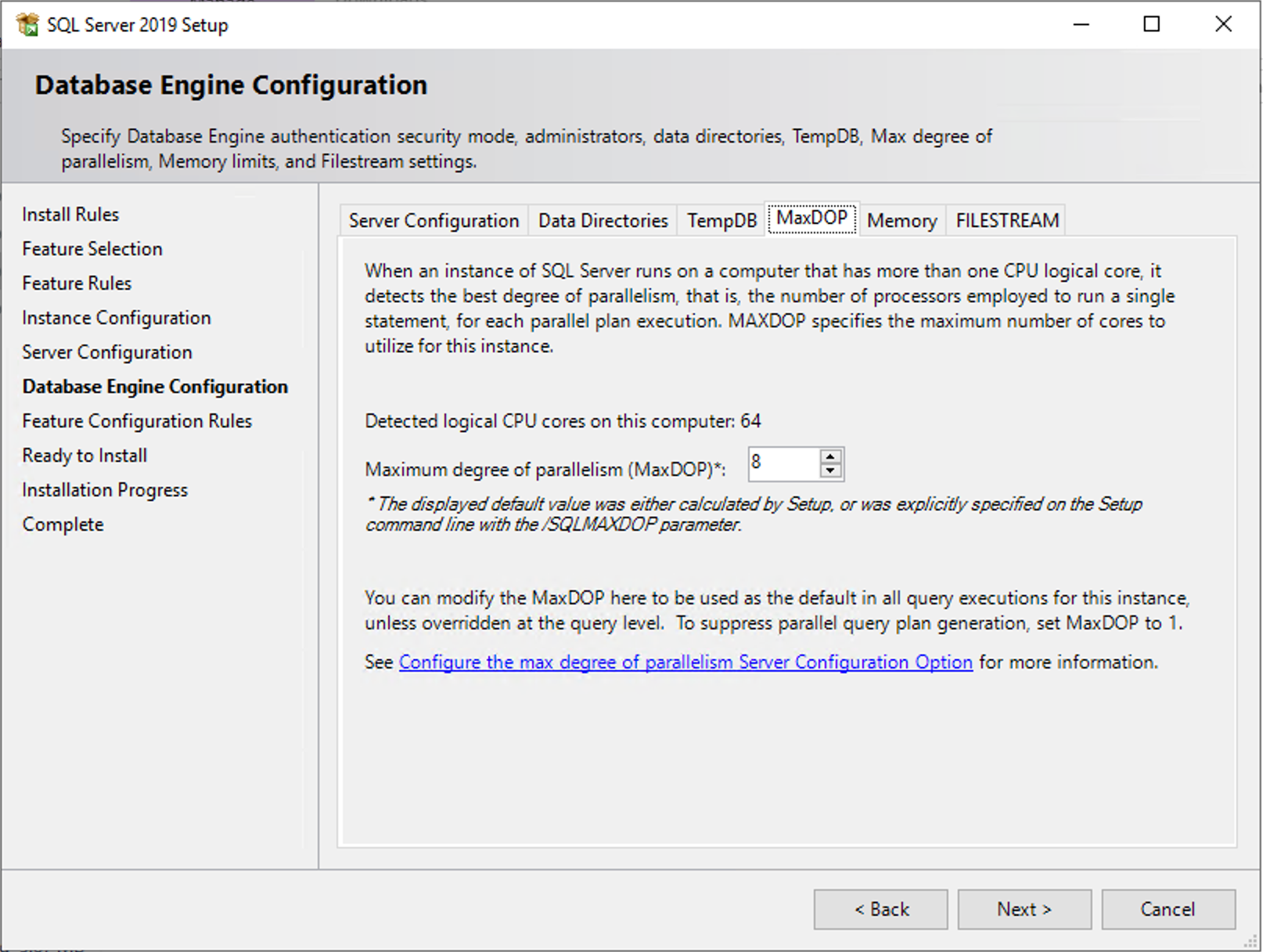 During setup, SQL Server suggests that we set MAXDOP to 8:
