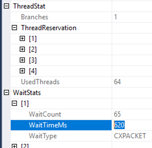 And the query burned up 64 worker threads and generated 620 milliseconds of CXPACKET wait – in a query that finished in under 100ms: