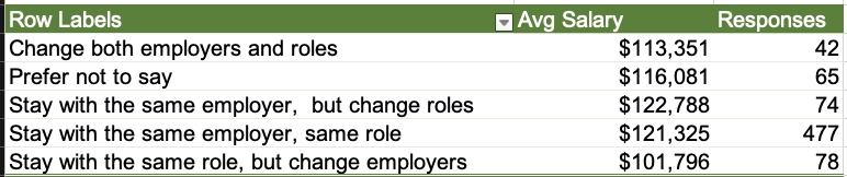 Most respondents intend to stay in the same employer, in the same role. Folks who are planning to make a change also happen to be getting paid less – and that’s probably not a coincidence, heh. If you’re thinking about changing roles, you’re probably interested in who’s bringing home the cheddar: