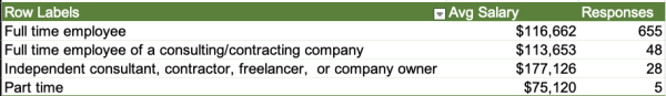 Normally I wouldn’t draw conclusions from just 4 respondents, but I think it’s safe to say that data scientists are in such high demand that they command higher pay. (However, it’s also harder to get a data scientist job than most of the rest of the jobs in this list.)