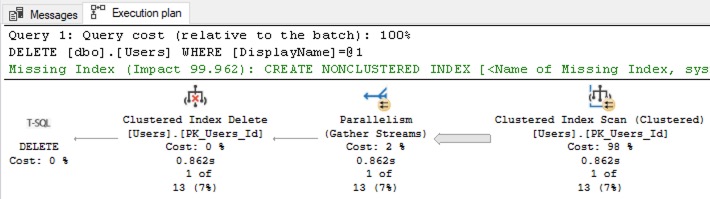 We read that from right to left. The first thing SQL Server has to do is scan the entire Users table to find the row(s) with DisplayName = ‘Brent Ozar’ because we don’t have an index on DisplayName. After it’s found them, then it’ll delete them from the clustered index.