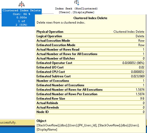 From right to left, SQL Server can open the index on DisplayName, seek into just the row it’s looking for, then delete the row from the clustered index. Be aware that the plan is simplifying things a little: if you hover your mouse over the Clustered Index Delete operator, you’ll see that at the very bottom of the tooltip, SQL Server shows two objects, not one: