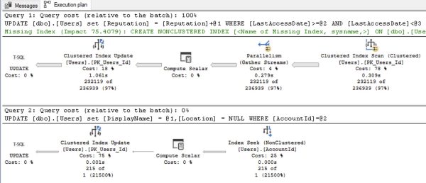 When you have indexes that includes one of the updated columns (as the Location) somewhere (not necessary as main column as in your first example), SQL server has to update this index not just for those few rows with AccountID = 0 but for all the thousand people who where active in the last two days and got just a Reputation bonus. The Location and DisplayName will (usually) be unchanged for those users but SQL Server can’t know this and has to “change” both columns too.