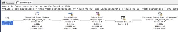 Then it can actually make sense to rewrite the query into a single faster (albeit heinous) UPDATE statement. To illustrate, let’s pretend that instead of giving reputation points away every 15 minutes, let’s say we only give them out once per day, to people who accessed the system yesterday. I’m going to use a hard-coded date in my WHERE clause because my Stack Overflow database didn’t have activity yesterday: