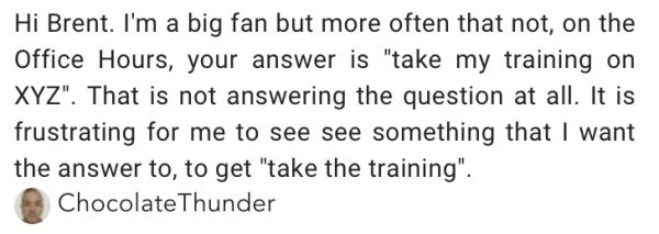 Love the office hours and more often than not you provide enough of an answer that gets the gears turning and then its either up to us to take it across the finish line or as you so eloquently state, take the training. You give immense amounts to this community, we can give back.