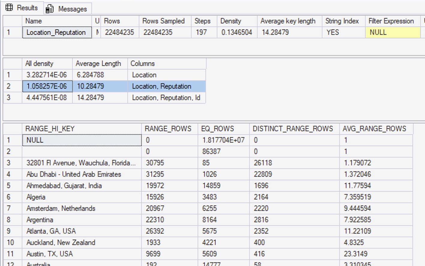 The output of DBCC SHOW_STATISTICS shows that we’ve got about 22 million rows in this table. So, what does the statistics histogram say about the relationships between locations and reputations?