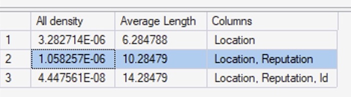 Back to our DBCC SHOW_STATISTICS output. We explained that the first row was the density vector for Location alone – so what’s the second row, which says Location, Reputation?
