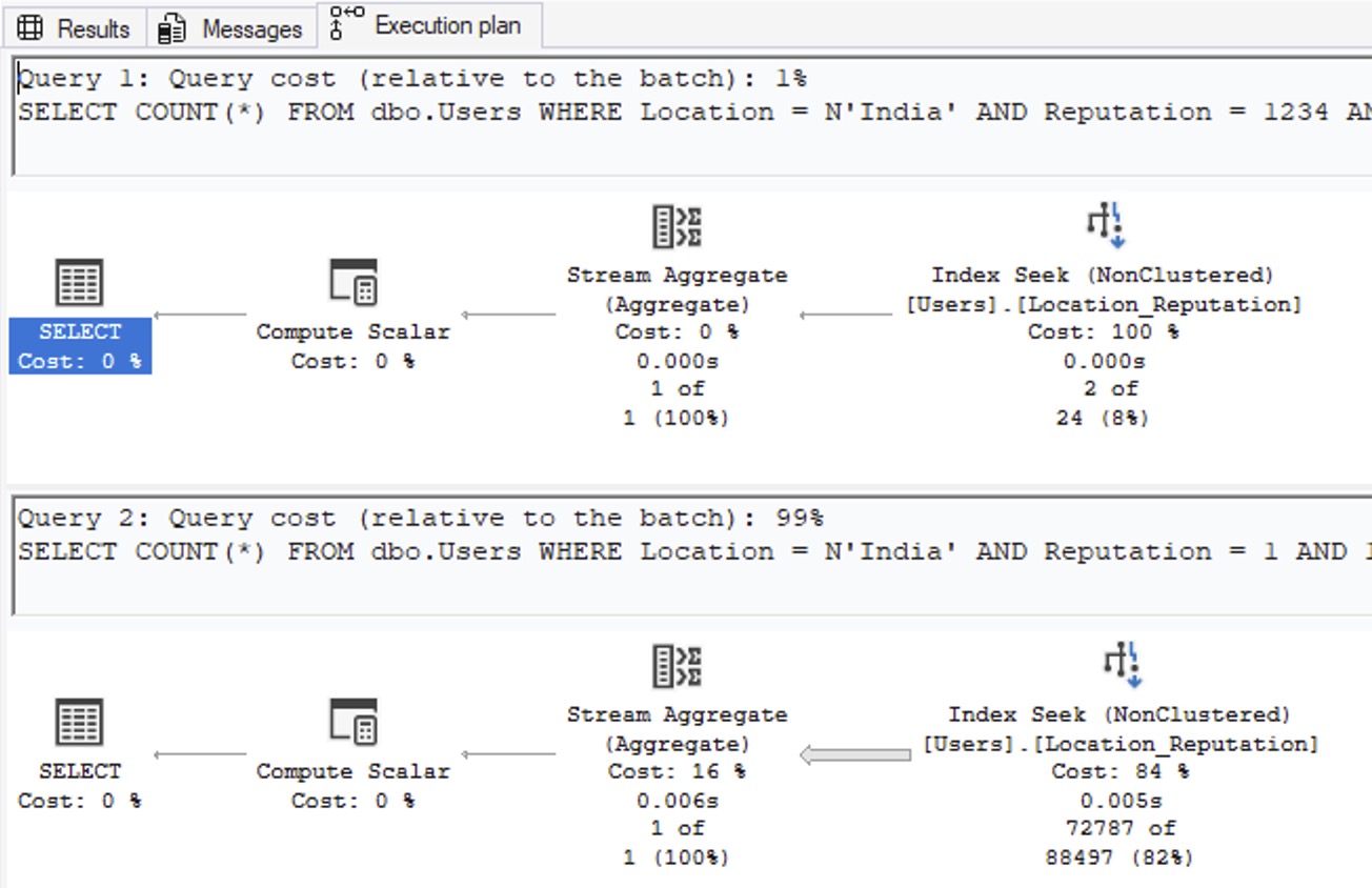 CREATE STATISTICS Stat_Location_Reputation ON dbo.Users(Location, Reputation) WITH FULLSCAN; CREATE STATISTICS Stat_Reputation_Location ON dbo.Users(Reputation, Location) WITH FULLSCAN; DBCC FREEPROCCACHE; GO SELECT COUNT(*) FROM dbo.Users WHERE Location = N'China' AND 1 = (SELECT 1); SELECT COUNT(*) FROM dbo.Users WHERE Reputation = 1000000 AND 1 = (SELECT 1); SELECT COUNT(*) FROM dbo.Users WHERE Reputation = 1000000 AND Location = N'China' AND 1 = (SELECT 1); |