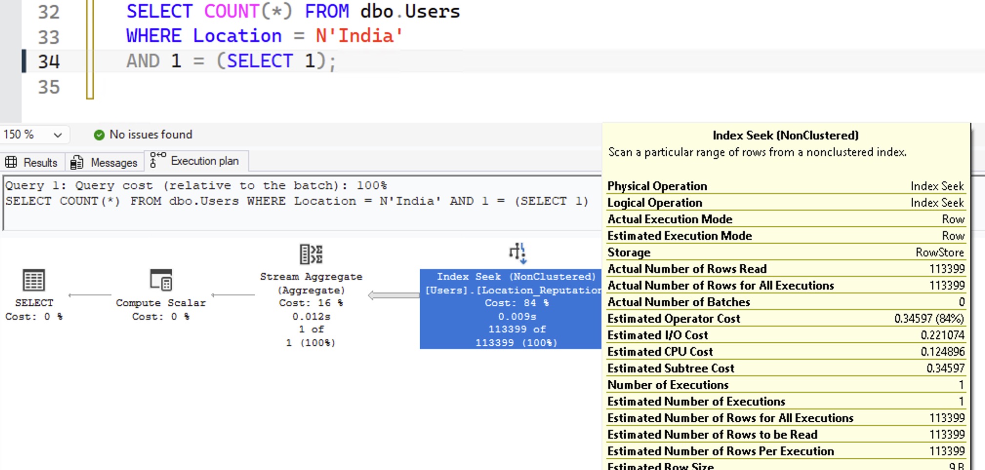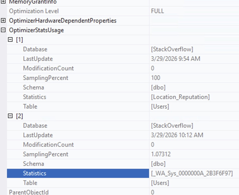 SQL Server manages to figure out that India is not only huge, but also that Reputation = 1 is huge. So, how’d it do that? Right-click on the SELECT operator of the second query, go into Properties, and then OptimizerStatsUsage: