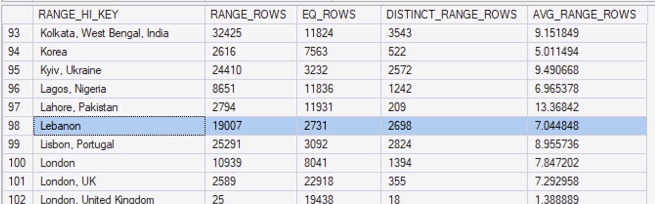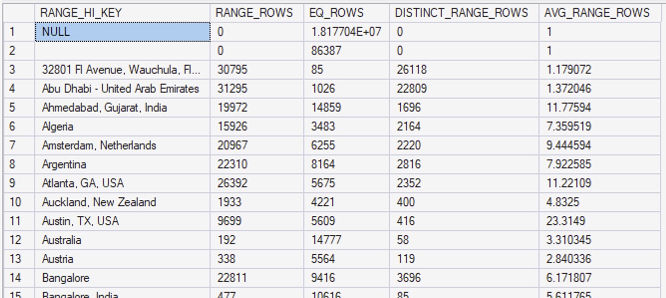 The next result set in DBCC SHOW_STATISTICS is the histogram, which contains the detailed list of up to 201 location values – because Location is the first column in our statistic: