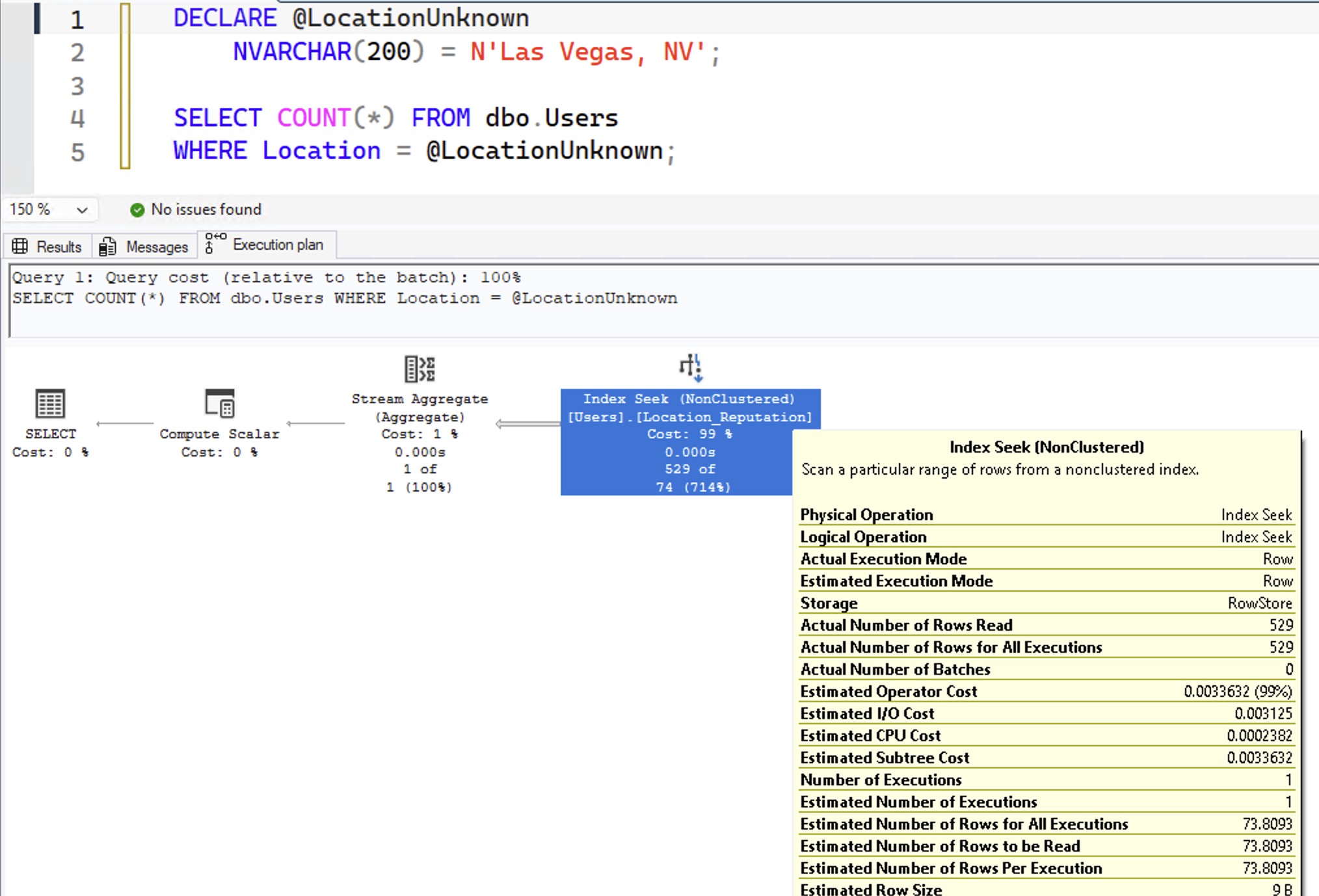 Here’s an example query to prove that. I’m using a local variable to prevent SQL Server from sniffing the value, so it’ll have no idea what the @LocationUnknown value will be at compilation time: