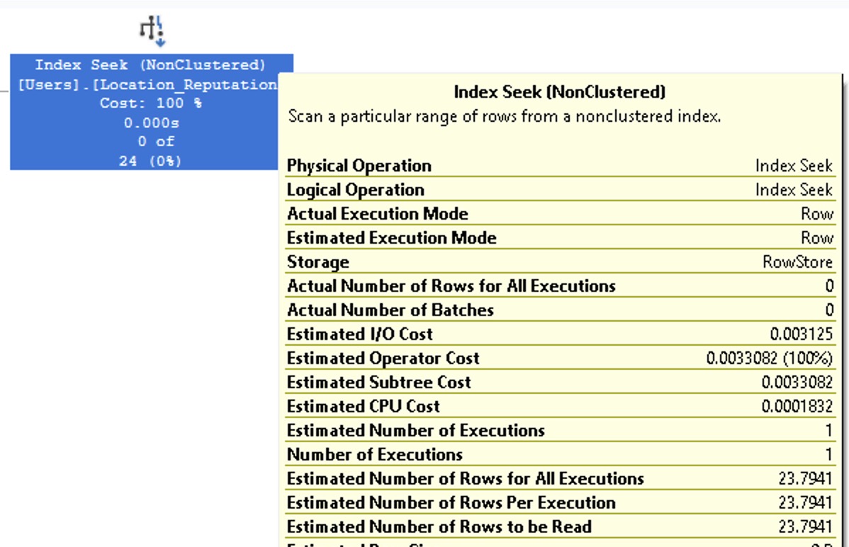 Look familiar? That’s a 7.04485 estimate. Exactly the same as if we weren’t filtering on reputation at all. It’s using the avg_range_rows from our statistics, giving us the exact same estimate that we got from just filtering on Location = Las Vegas.
