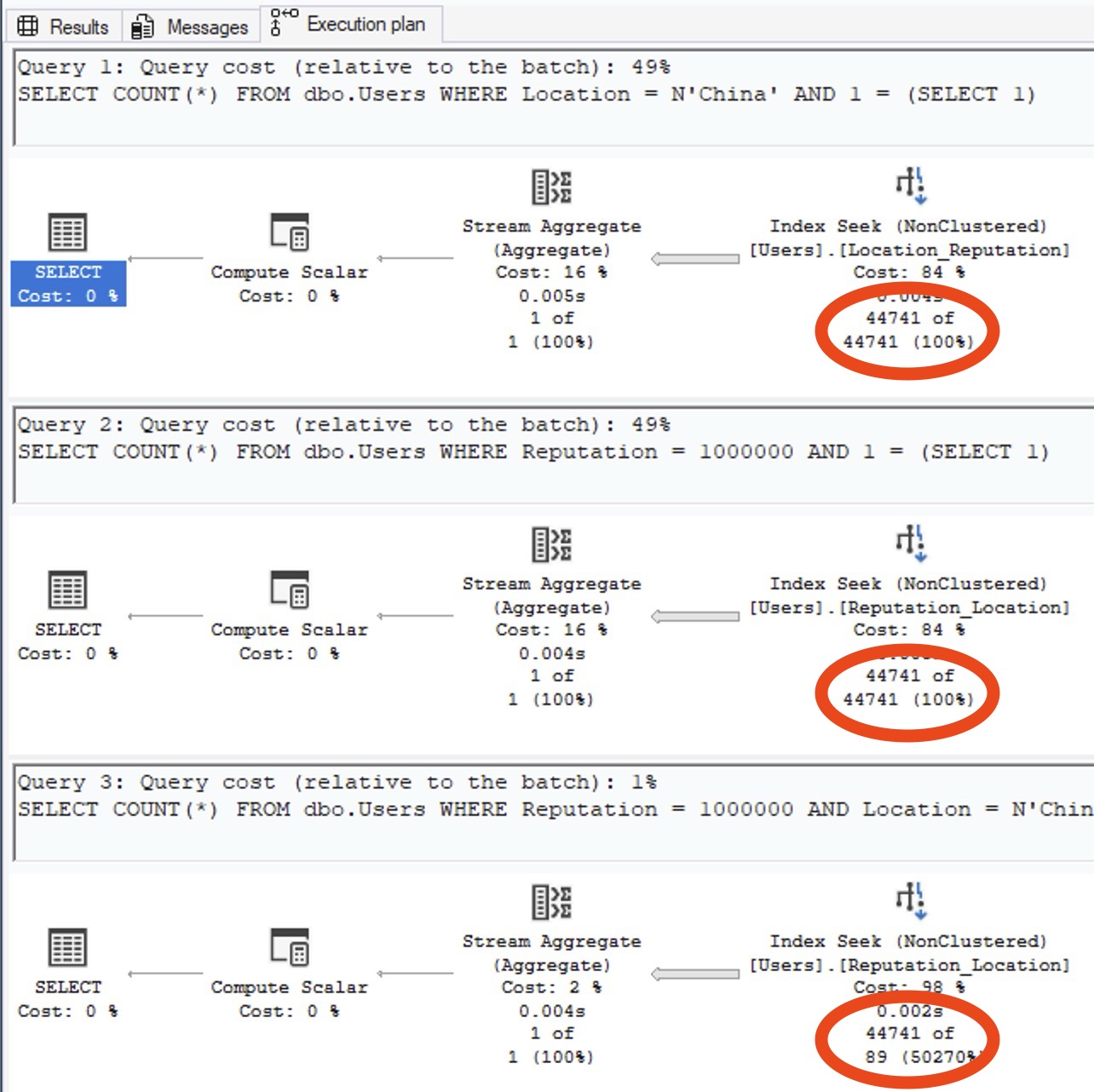 To really prove it, let’s set up an artificial scenario. Let’s say that everyone in China has really high reputation. And, just to give SQL Server the best defenses possible, let’s create a multi-column index (and therefore stat) on Reputation, Location. Hell, let’s even update statistics on Users so that our existing Location, Reputation stat completely understands that China’s where the smart people are at: