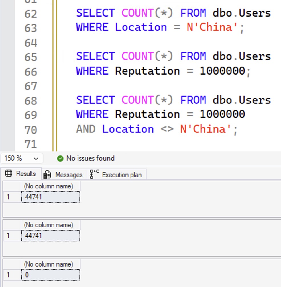 SELECT COUNT(*) FROM dbo.Users WHERE Location = N'China'; SELECT COUNT(*) FROM dbo.Users WHERE Reputation = 1000000; SELECT COUNT(*) FROM dbo.Users WHERE Reputation = 1000000 AND Location <> N'China'; |