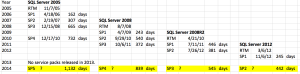 Check out SQLServerBuilds.blogspot.com, a site that lists cumulative updates and service packs. Here’s a remixed version: SQL Server Service Pack Release Dates The first service pack seems to come out fairly quickly, but after the first one, it’s a year or more. Makes sense – you find a lot of bugs quickly, right? Microsoft released…