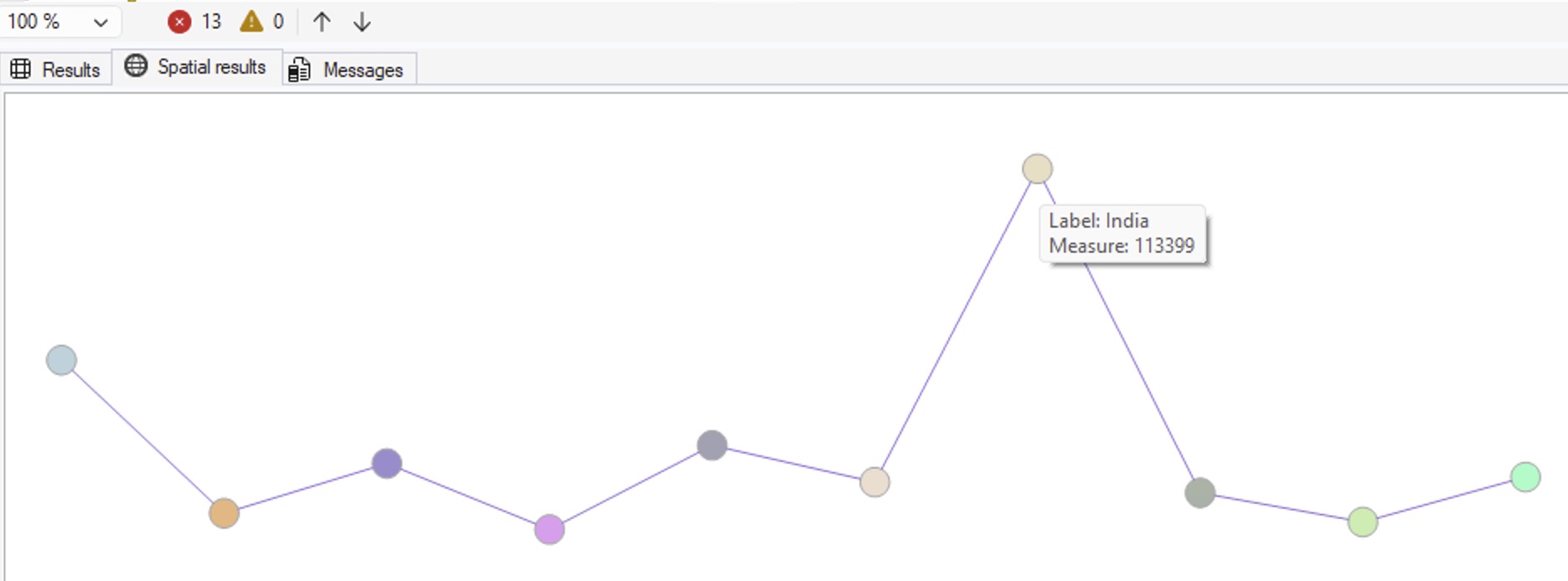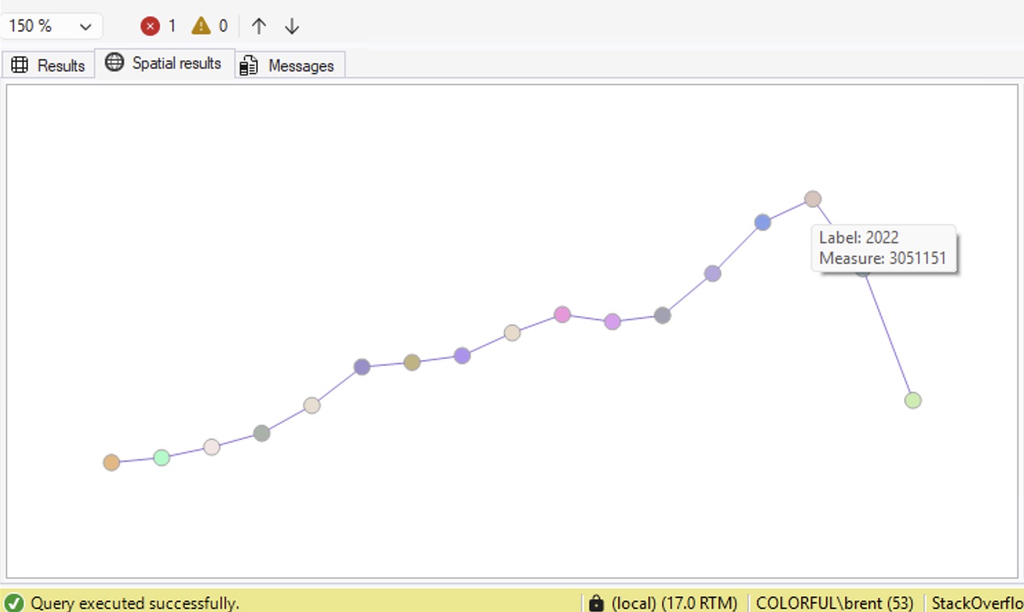 Given the query in this window, graph the results as a line chart in the SSMS Spatial Results tab using these rules:1. Wrap the original query in a CTE called SourceData2. Create a ScaledData CTE that scales X values to 0–300 and Y values to 0–100 using window functions MIN/MAX OVER()3. Build a LINESTRING geometry from the scaled points4. Use STDifference to cut holes in the line where data points are, so tooltips don’t conflict5. Use STBuffer(3) to make each data point a large circle6. UNION ALL the line (with holes) and the circles, with the line row having NULL for all non-geometry columns7. The first column in the SELECT should be the X-axis label, the second column should be the Y-axis measure, and the third column should be the geometry — so tooltips show meaningful data when hovering over circles
